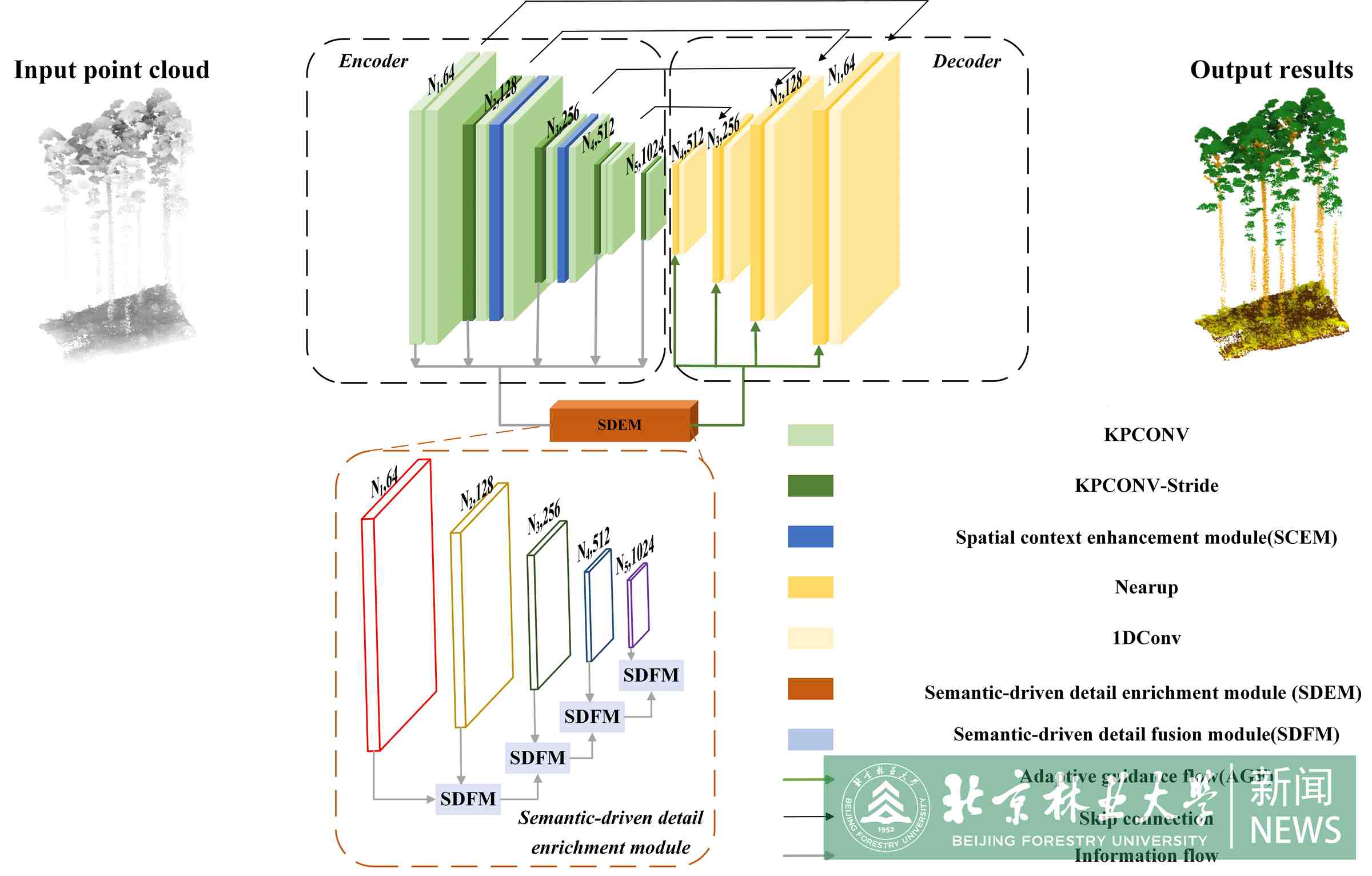 近期,信息學(xué)院(人工智能學(xué)院)盧昊副教授研究團(tuán)隊(duì)聯(lián)合中國(guó)林業(yè)科學(xué)研究院、瑞士聯(lián)邦森林、雪與景觀研究所(WSL)等機(jī)構(gòu)研究人員,在遙感領(lǐng)域頂刊《Remote Sensing of Environment》(中國(guó)科學(xué)院一區(qū)Top,IF=11.1)上發(fā)表題為"Towards a point cloud understanding framework for forest scene semantic segmentation across forest types and sensor platforms"的研究成果。該研究針對(duì)復(fù)雜森林場(chǎng)景,提出了大規(guī)模三維點(diǎn)云理解的神經(jīng)網(wǎng)絡(luò)模型Sen-net,實(shí)現(xiàn)了點(diǎn)云多種組分的高精度語(yǔ)義分割。