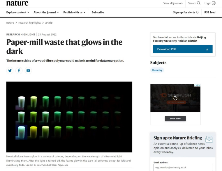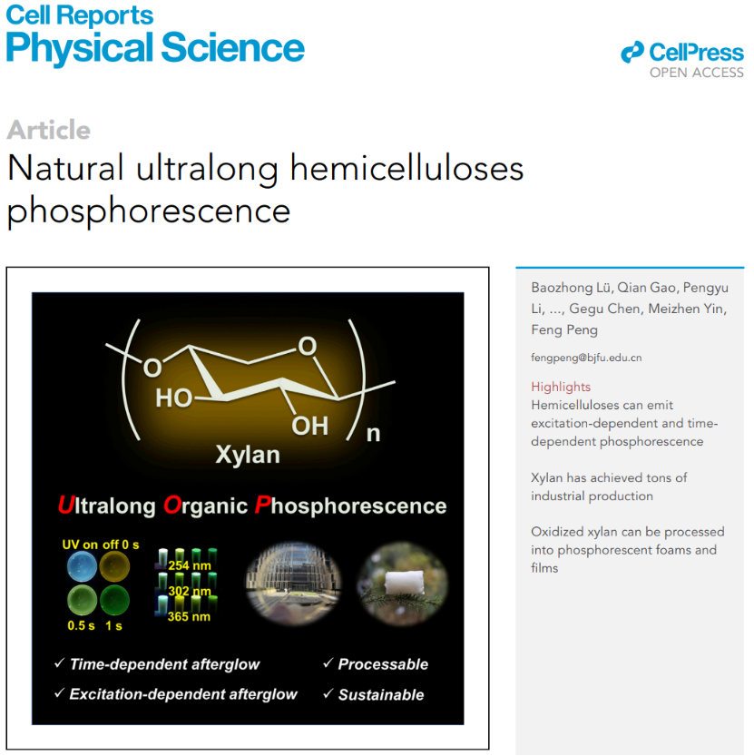 近期,我校材料學(xué)院彭鋒教授團(tuán)隊(duì)率先發(fā)現(xiàn)了經(jīng)濃堿提取的高結(jié)晶性聚木糖類半纖維素的室溫磷光現(xiàn)象,相關(guān)成果在Cell Press出版集團(tuán)旗下綜合期刊《Cell Reports Physical Science》在線發(fā)表,引起了領(lǐng)域內(nèi)的高度關(guān)注。日前,《Nature》雜志將該成果遴選為Research Highlights(研究亮點(diǎn)),以“Paper-mill waste that glows in the dark”為題進(jìn)行了報(bào)道,并從制漿造紙副產(chǎn)物再利用的角度充分肯定了該研究工作的價(jià)值與意義。Nature研究亮點(diǎn)文章每年遴選300-400項(xiàng)工作,主要描述發(fā)表在本刊或其他期刊的科學(xué)和技術(shù)全領(lǐng)域研究進(jìn)展,關(guān)注主要研究結(jié)果,強(qiáng)調(diào)其顯著的意義,并對(duì)該研究主題提供進(jìn)一步的討論。