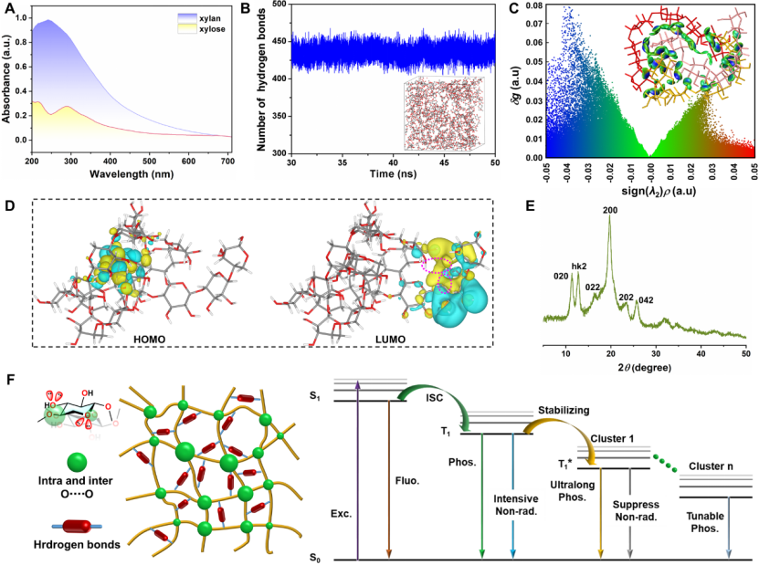 據(jù)文章第一作者青年教師呂保中介紹,自然界中纖維素、蛋白質(zhì)、松香等天然產(chǎn)物均存在著有趣的光致發(fā)光現(xiàn)象,最為常見的光致發(fā)光即熒光和磷光,研究和解釋這一類發(fā)光體背后的奧秘具有重要科學(xué)意義。已有研究表明木糖具有顏色可調(diào)諧磷光,但經(jīng)實(shí)驗(yàn)及測(cè)試發(fā)現(xiàn)木糖的磷光強(qiáng)度很弱,特別是用長(zhǎng)波長(zhǎng)紫外光激發(fā)時(shí)磷光難以用肉眼捕捉。通過對(duì)比木糖和聚木糖的紫外-可見光吸收光譜發(fā)現(xiàn),高分子狀態(tài)下的聚木糖在250 nm以上區(qū)域會(huì)產(chǎn)生更強(qiáng)烈的吸收,此區(qū)域的吸收由形成團(tuán)簇的復(fù)雜電子振動(dòng)引起,因此,聚木糖形成了更大、更緊密的團(tuán)簇,更利于發(fā)出磷光。同時(shí),分子動(dòng)力學(xué)模擬證明聚木糖中存在大量的氫鍵,獨(dú)立梯度模型也表明了聚木糖分子間存在非共價(jià)相互作用,能級(jí)計(jì)算分析出聚木糖分子間存在空間共軛效應(yīng)。基于以上因素的共同作用,聚集的簇構(gòu)成了多樣的發(fā)光中心,同時(shí)聚木糖的大分子結(jié)晶構(gòu)象能有效限制分子運(yùn)動(dòng),穩(wěn)定三線激發(fā)態(tài),最終導(dǎo)致聚木糖獨(dú)特的長(zhǎng)壽命顏色可調(diào)諧室溫磷光現(xiàn)象的產(chǎn)生。