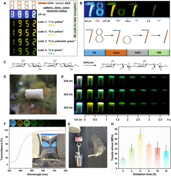 聚木糖獨(dú)特的余輝顏色變化特征賦予了材料優(yōu)異的信息加密、存儲(chǔ)及防偽功能。可進(jìn)一步通過氧化反應(yīng)將聚木糖轉(zhuǎn)化為水溶性雙醛聚木糖,賦予其加工成型特性,同時(shí)羰基的引入可有效促進(jìn)三線態(tài)激子的產(chǎn)生,其壽命延長(zhǎng)至近700毫秒,磷光量子產(chǎn)率高達(dá)5.8%。由于水溶性雙醛聚木糖良好的可加工特性,可進(jìn)一步將其制備成性能優(yōu)異的塑形磷光泡沫以及大尺寸、高機(jī)械強(qiáng)度的透明磷光薄膜材料。“本研究為半纖維素開拓了新的應(yīng)用領(lǐng)域,即顏色可調(diào)室溫磷光體系,并為半纖維素室溫磷光材料的設(shè)計(jì)提供理論依據(jù)和技術(shù)支撐,推進(jìn)了有機(jī)室溫磷光領(lǐng)域的綠色發(fā)展,有望在未來滿足社會(huì)對(duì)低成本、無污染、高性能磷光信息功能材料的需求。”彭鋒教授如是總結(jié)說。