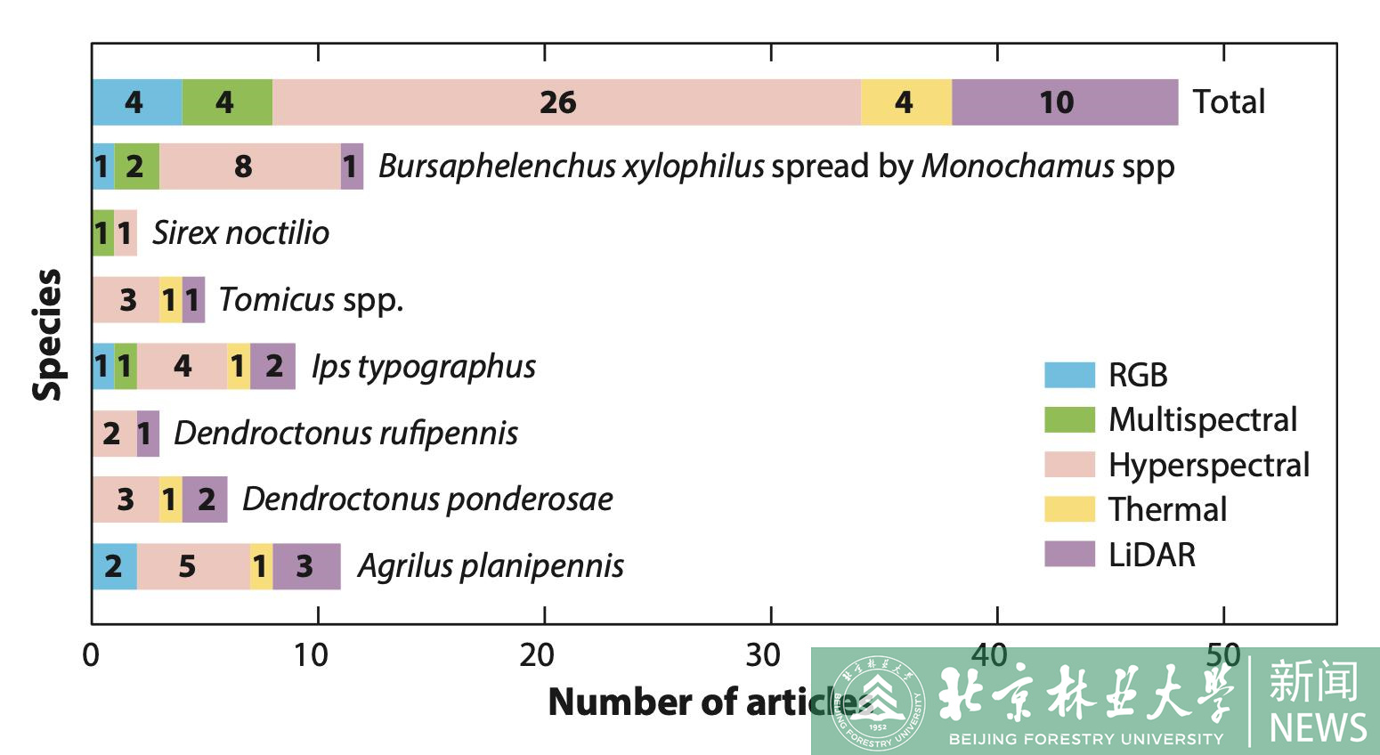 林木鉆蛀性害蟲(chóng)危害隱蔽、癥狀滯后,常規(guī)手段發(fā)現(xiàn)時(shí)往往已連片成災(zāi),但遙感技術(shù)具有實(shí)現(xiàn)林木鉆蛀性害蟲(chóng)早期監(jiān)測(cè)的潛力與可能。北京林業(yè)大學(xué)駱有慶教授研究團(tuán)隊(duì)的論文“Early Monitoring of Forest Wood-Boring Pests with Remote Sensing”,近期已在昆蟲(chóng)學(xué)國(guó)際頂級(jí)期刊《Annual Review of Entomology》(IF="22.682)上在線發(fā)表。