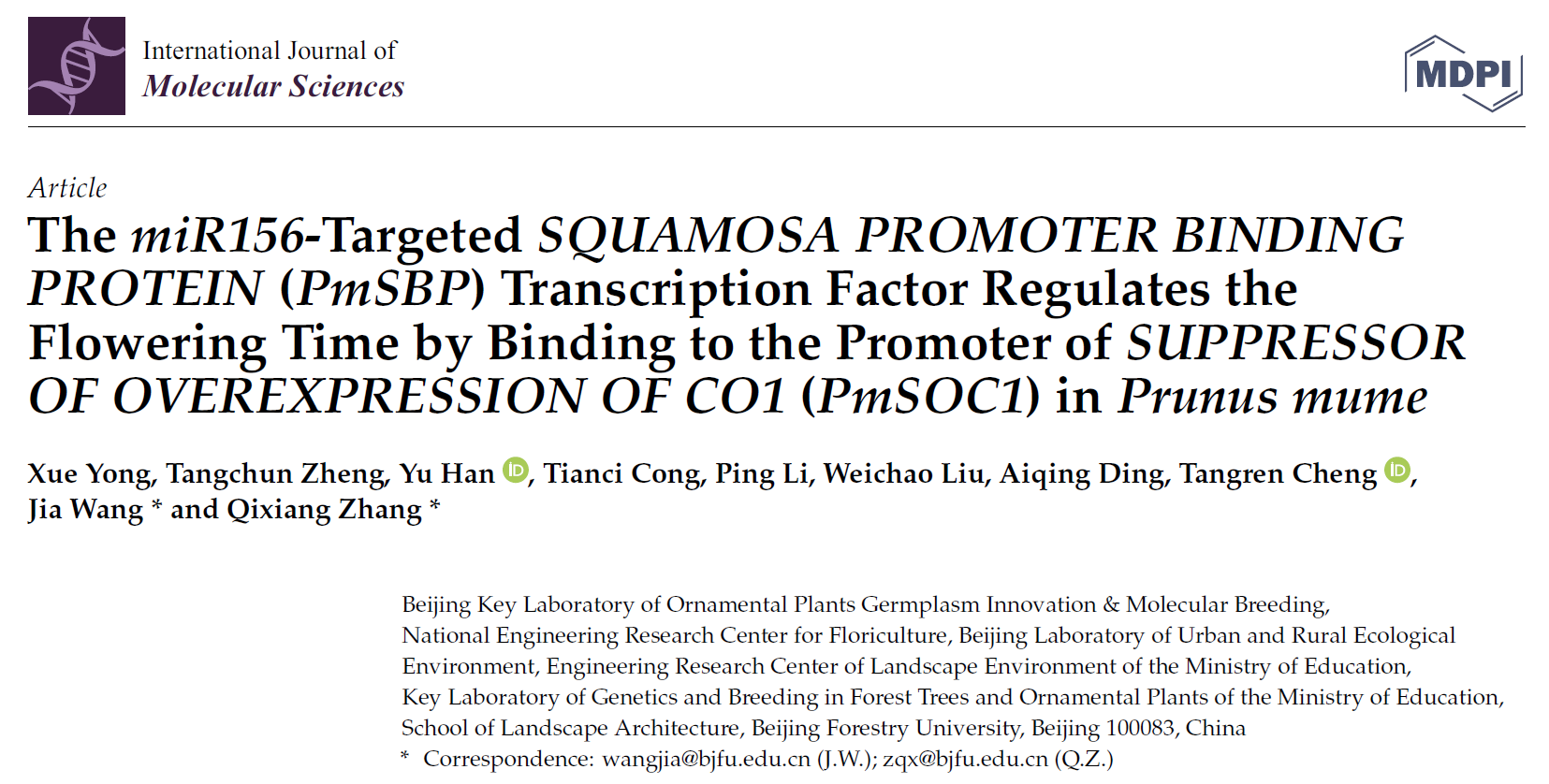 近日,International Journal of Molecular Sciences(中科院二區Top,IF=6.208)在線發表了北京林業大學張啟翔教授團隊題為The miR156-targeted SQUAMOSA PROMOTER BINDING PROTEIN ( PmSBP ) transcription factor regulates the flowering time by binding to the promoter of SUPPRESSOR OF OVEREXPRESSION OF CO1 ( PmSOC1 ) in Prunus mume 的研究論文。