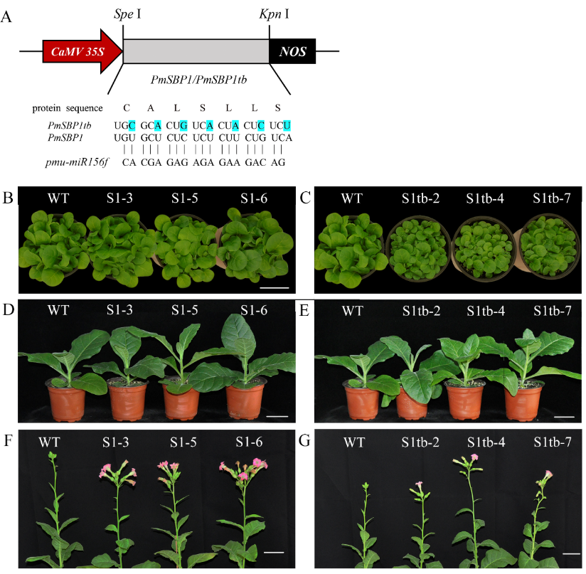 圖1. 梅花 PmSBP1 和 PmSBP1tb 基因在煙草中過表達表型
