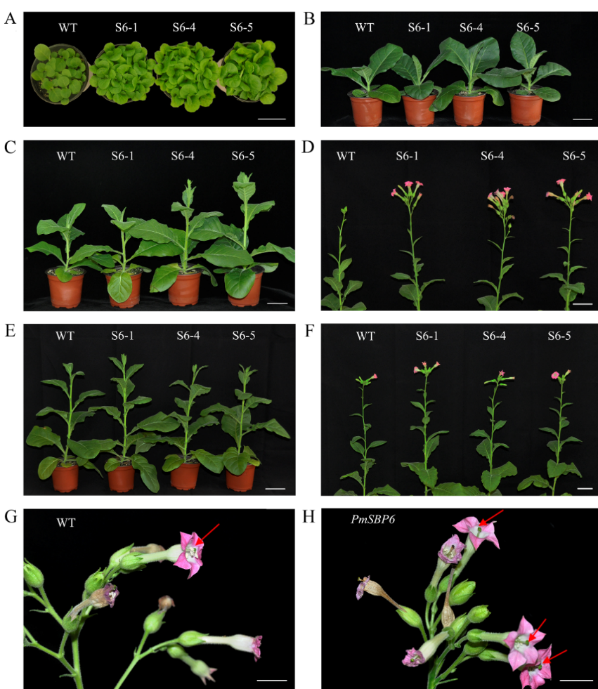圖2. 梅花 PmSBP6 基因在煙草中過表達表型