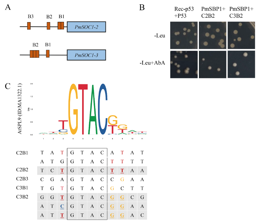 圖3. 梅花PmSBP1與 P mSOC1s 啟動子互作