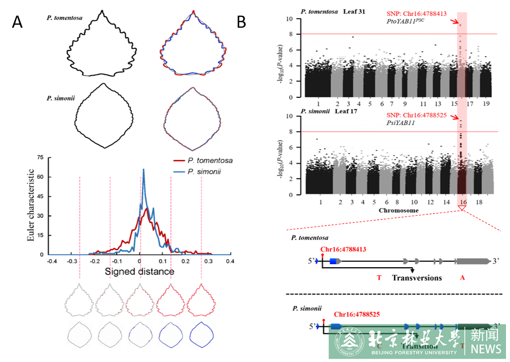 2023年01月03日,Plant Physiology在線(xiàn)發(fā)表了生物科學(xué)與技術(shù)學(xué)院宋躍朋教授課題組“Enhanced genome-wide association reveals the role of YABBY11-NGATHA-LIKE1 in leaf serration development of Populus”的研究論文。該研究以葉形差異顯著的毛白楊與小葉楊種質(zhì)資源群體為材料,通過(guò)持續(xù)同調(diào)(Persistent homology)拓?fù)鋽?shù)據(jù)分析方法完成葉片形態(tài)特征的高通量量化,利用全基因組關(guān)聯(lián)分析策略,對(duì)調(diào)控毛白楊與小葉楊葉形變異的關(guān)鍵基因定位。研究發(fā)現(xiàn)植物特異的葉片發(fā)育調(diào)控轉(zhuǎn)錄因子YABBY11與楊樹(shù)葉形自然變異顯著關(guān)聯(lián)。基因功能解析表明在毛白楊基因組中YABBY11攜帶提前終止位點(diǎn)(PtoYAB11PSC),致使其鋅指結(jié)構(gòu)域缺失,進(jìn)而喪失對(duì)下游靶基因PtoNGAL-1與PtoRBCL的轉(zhuǎn)錄激活作用,導(dǎo)致葉片邊緣的鋸齒加劇、面積增大、光合利用效率提升。