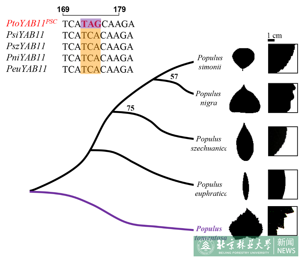 楊樹(shù)葉片形態(tài)變異豐富,在種間與種內(nèi)都存在顯著的自然變異。為解析楊樹(shù)葉片形態(tài)自然變異的遺傳學(xué)基礎(chǔ),研究者利用兩種葉形顯著差異的楊樹(shù)——毛白楊與小葉楊種質(zhì)資源群體為研究材料。利用持續(xù)同調(diào)拓?fù)鋽?shù)據(jù)分析方法將楊樹(shù)葉片形態(tài)量化為112個(gè)表型值。其中,54%的葉片表型性狀廣義遺傳力大于0.4,屬于中高遺傳力性狀。GWAS結(jié)果顯示在毛白楊群體中有138個(gè)SNP位點(diǎn)與9個(gè)葉片表型顯著關(guān)聯(lián),在小葉楊群體中,有171SNPs位點(diǎn)與8個(gè)葉片表型顯著關(guān)聯(lián)。在兩個(gè)關(guān)聯(lián)群體中,基因型-表型關(guān)聯(lián)顯著性最高的SNPs均位于YABBY11基因上。候選基因序列分析表明在毛白楊群體中,YABBY11攜帶提前終止位點(diǎn)(PtoYABBY11PSC),提前終止的氨基酸序列與DNA結(jié)合的鋅指結(jié)構(gòu)域完全丟失,僅保留了核定位信號(hào)。研究者選擇YABBY11為候選基因構(gòu)建楊屬系統(tǒng)發(fā)育樹(shù),結(jié)果顯示提前終止位點(diǎn)僅存在白楊派中,暗示了YABBY11PSC可能是一個(gè)白楊派特異的基因變體。