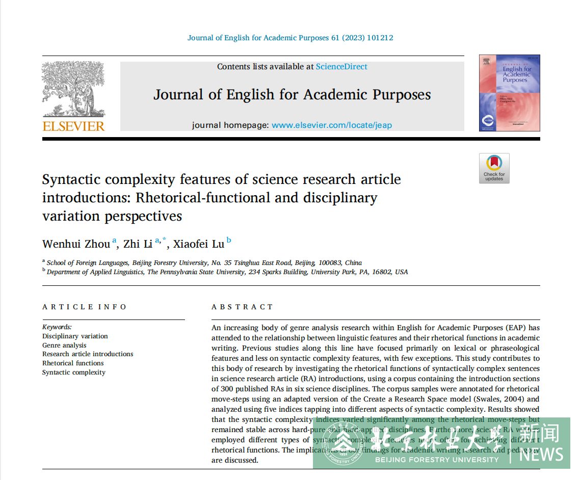 近日,北京林業(yè)大學(xué)外語(yǔ)學(xué)院最新研究成果“Syntactic complexity features of science research article introductions: Rhetorical-functional and disciplinary variation perspectives”在語(yǔ)言學(xué)高水平國(guó)際期刊Journal of English for Academic Purposes(SSCI語(yǔ)言學(xué)類(lèi)一區(qū),Q1,影響因子2.811)上發(fā)表。論文第一作者是北京林業(yè)大學(xué)外語(yǔ)學(xué)院2019級(jí)外國(guó)語(yǔ)言學(xué)及應(yīng)用語(yǔ)言學(xué)方向碩士研究生周文慧,通訊作者為北京林業(yè)大學(xué)外語(yǔ)學(xué)院院長(zhǎng)李芝教授,北京林業(yè)大學(xué)為第一單位。美國(guó)賓夕法尼亞州立大學(xué)陸小飛教授參與指導(dǎo)。