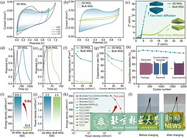 隨著可再生能源和高效能量存儲設備的需求急劇增加,超級電容器因其卓越的功率密度和快速充放電能力,正在成為下一個能源科技領域的焦點。超級電容器性能提升的關鍵在于電極材料的創(chuàng)新設計。材料學院許鳳教授團隊成功研發(fā)了一種全新的3D打印電極油墨配方,結合了木質素、MXene和氧化石墨烯,通過先進的3D打印技術,制造出具有垂直排列孔結構的厚電極。該技術不僅顯著提升了電極的質量負載,還實現(xiàn)了突破性的面積比電容,達到8.6 F/cm2,超出傳統(tǒng)厚電極近10倍!這種3D打印電極大幅提高了超級電容器的能量密度,為未來的高效能量存儲提供了強有力的支持。
