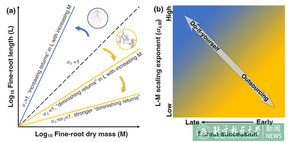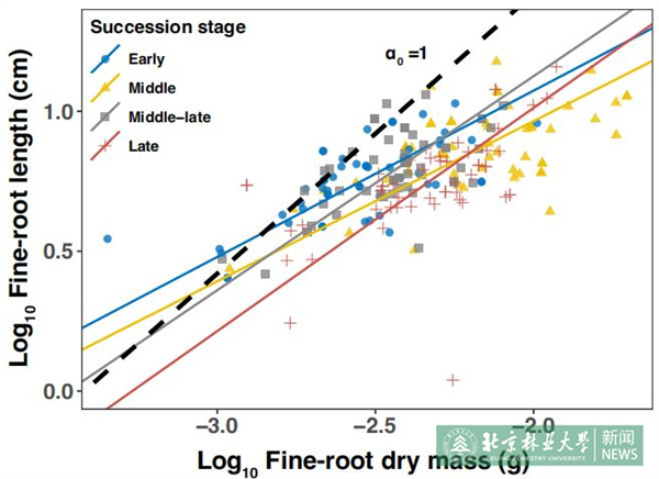 結果表明,細根根長存在“收益遞減”現象。并且,演替后期森林的冪指數高于演替早期森林,這與細根在演替后期采取“自己做”(DIY) 的策略向演替早期“外包”(Outsourcing) 給真菌的策略間的過渡相一致。