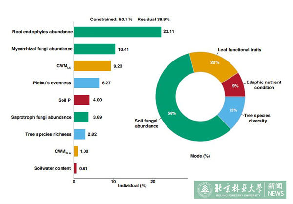 通過分析土壤條件、葉片功能性狀、樹種多樣性和土壤真菌四大類因子對L-M冪指數的相對影響大小,結果表明土壤真菌多度是主要的驅動因子(共解釋了58%的變異),其中根內生真菌的解釋力最高(22%),其次是菌根真菌(10.41%)。其他三類因子作用較弱。