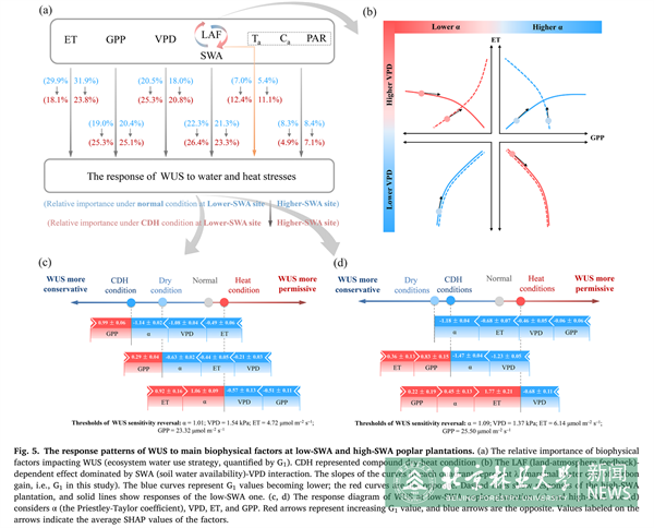 為此,本研究以中國北方常用人工林樹種——歐美楊為研究對象,基于兩個不同土壤水分條件楊樹人工林的長期通量和微氣象觀測數據,深入探討了生態系統水分條件在人工林應對干-熱復合脅迫事件的介導作用。同時,利用多個機器學習算法和模型無關解釋,揭示主要生物物理因素對生態系統水分利用策略的協同效應。