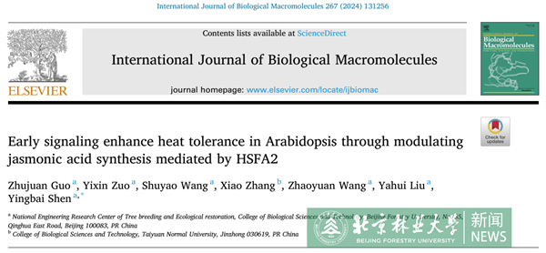 近日,生物科學與技術學院沈應柏教授團隊在International Journal of Biological Macromolecules(一區,TOP期刊,IF=8.2)上發表了題為“Early signaling enhance heat tolerance in Arabidopsis through modulating jasmonic acid synthesis mediated by HSFA2”的研究論文。
