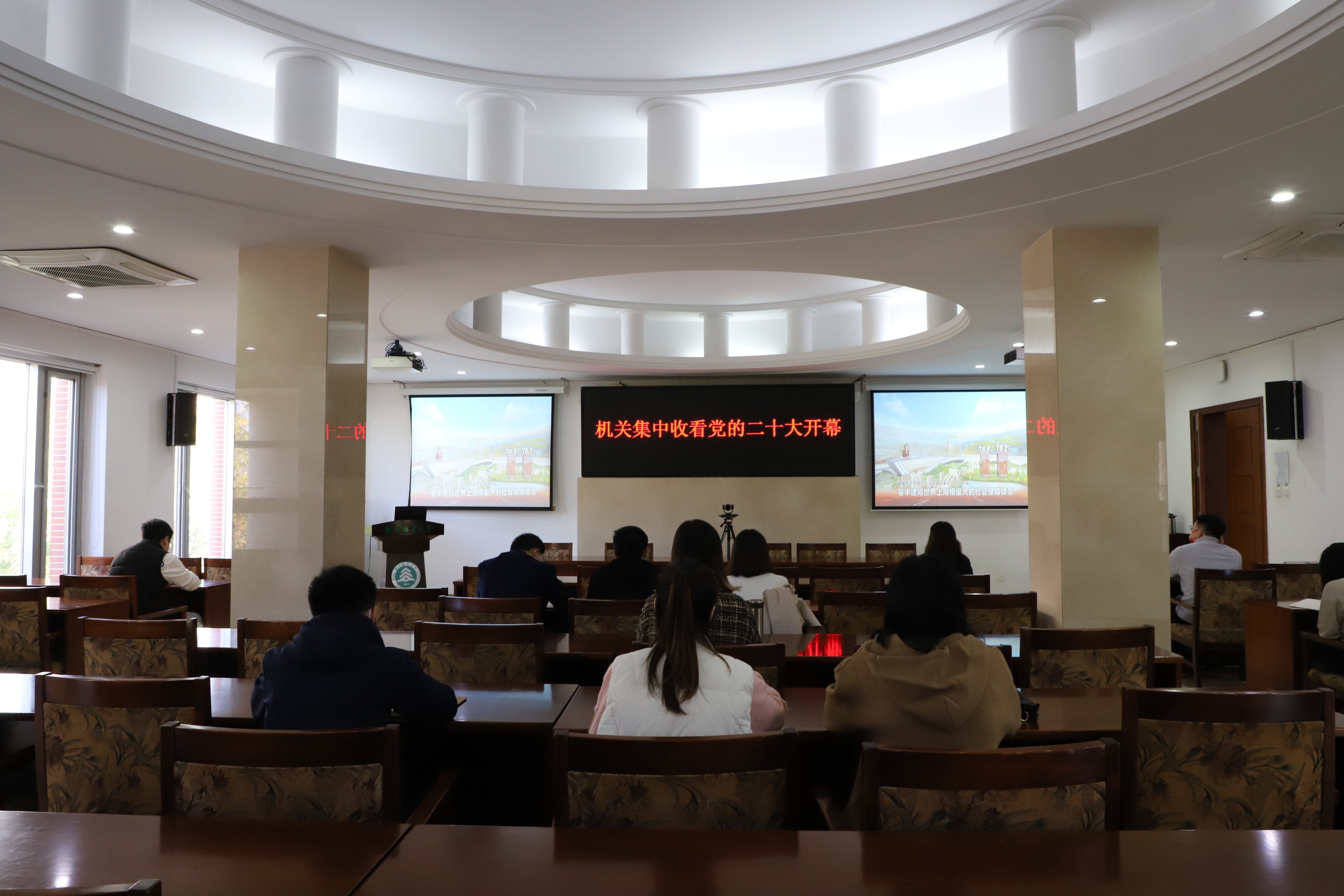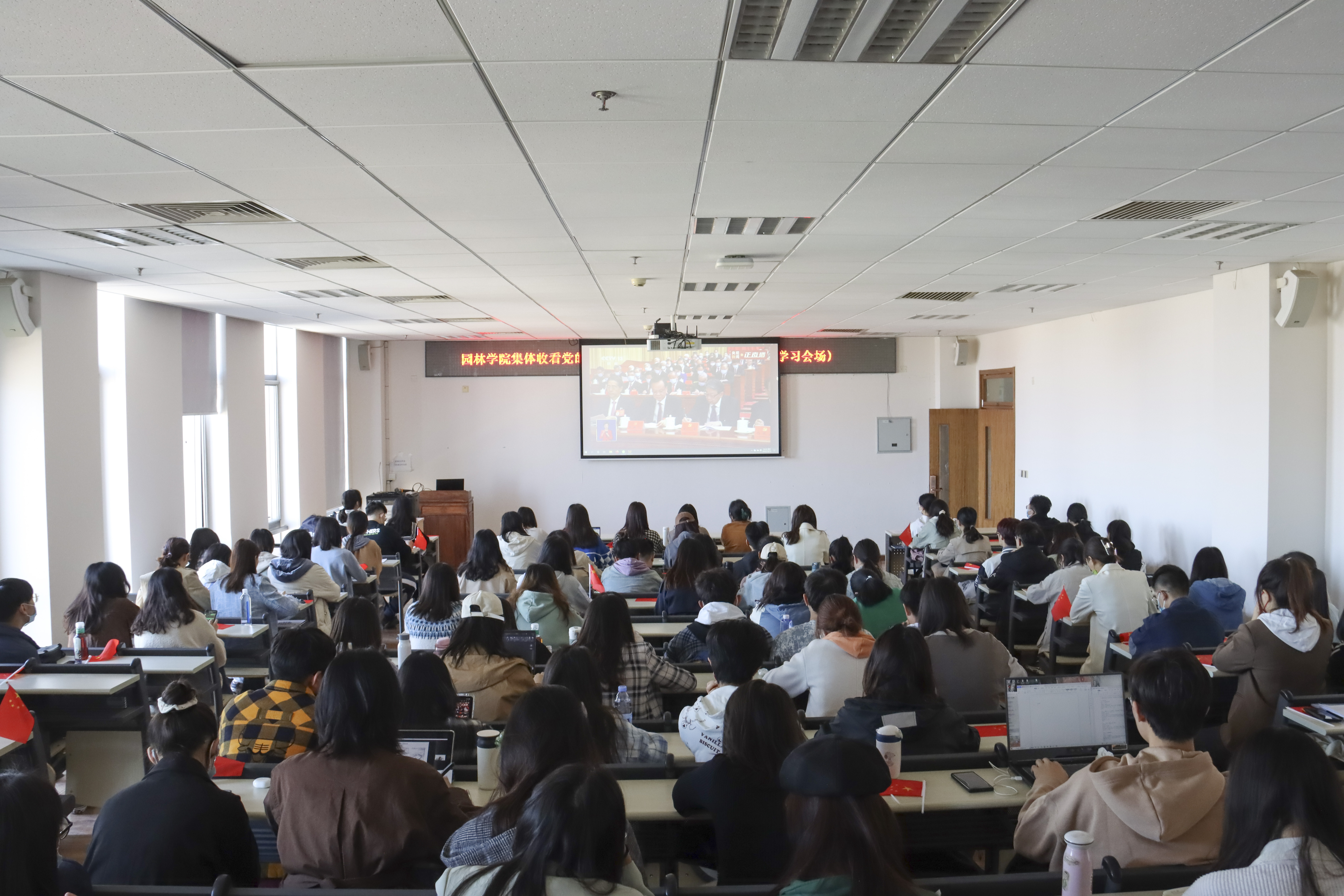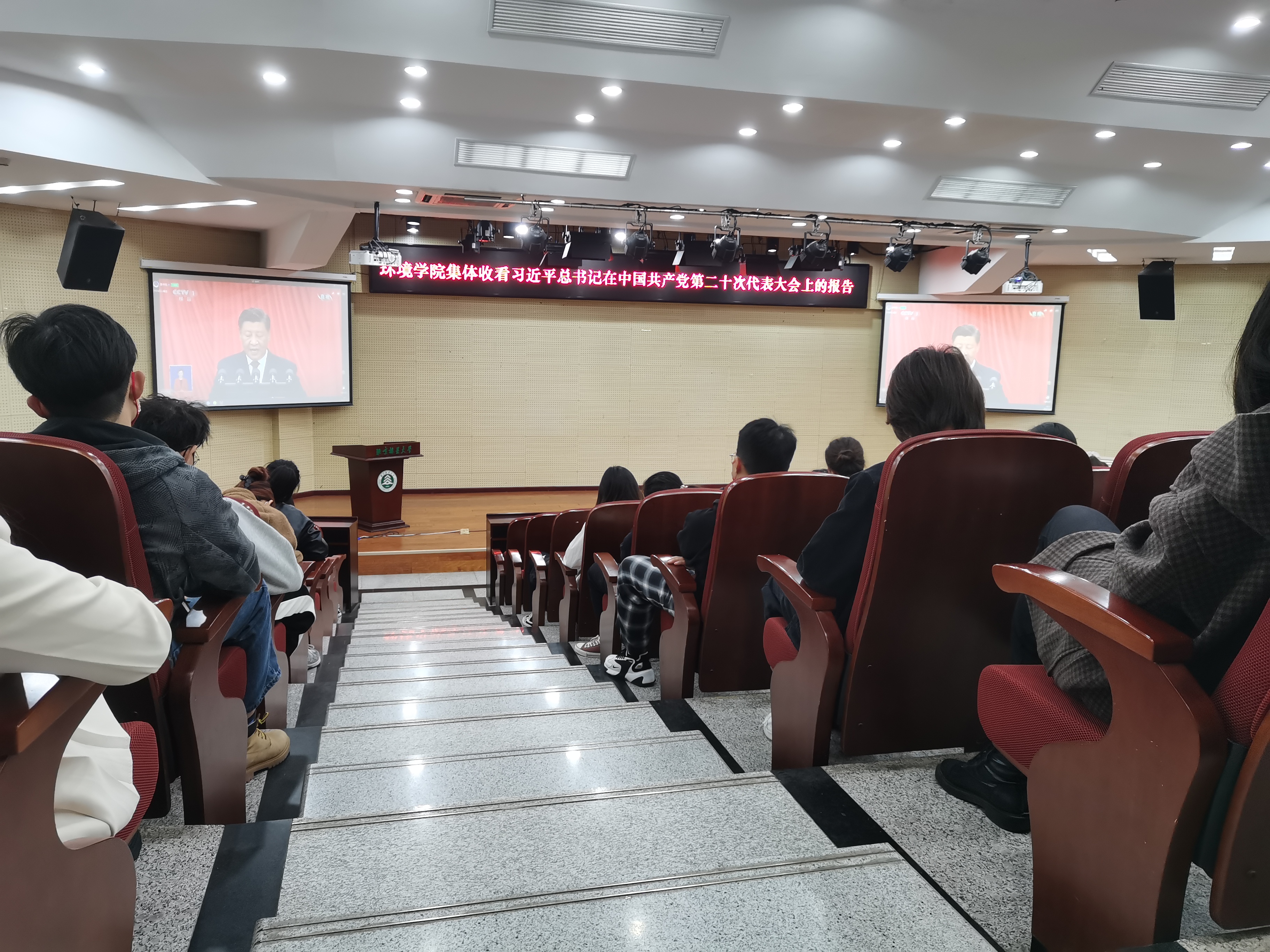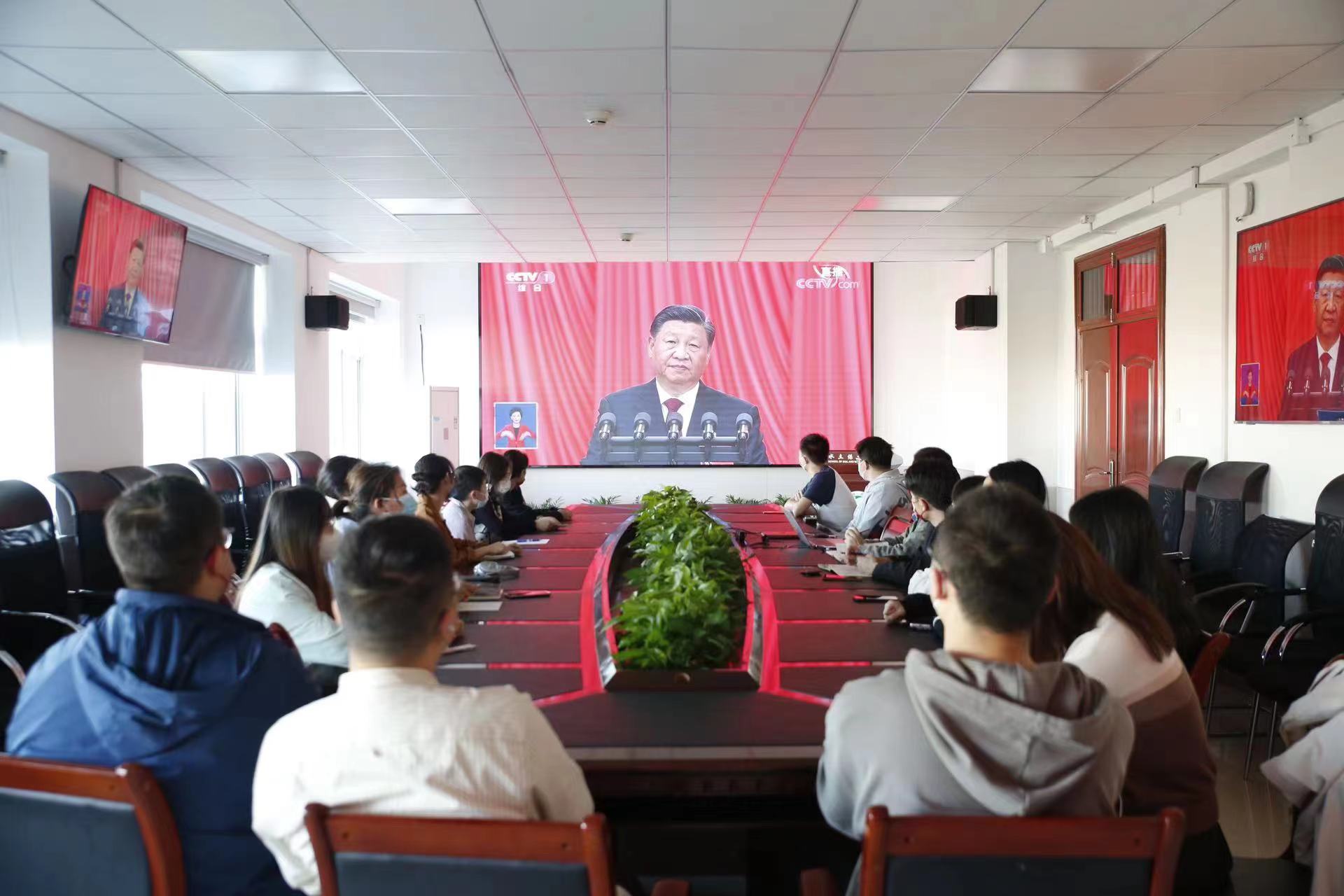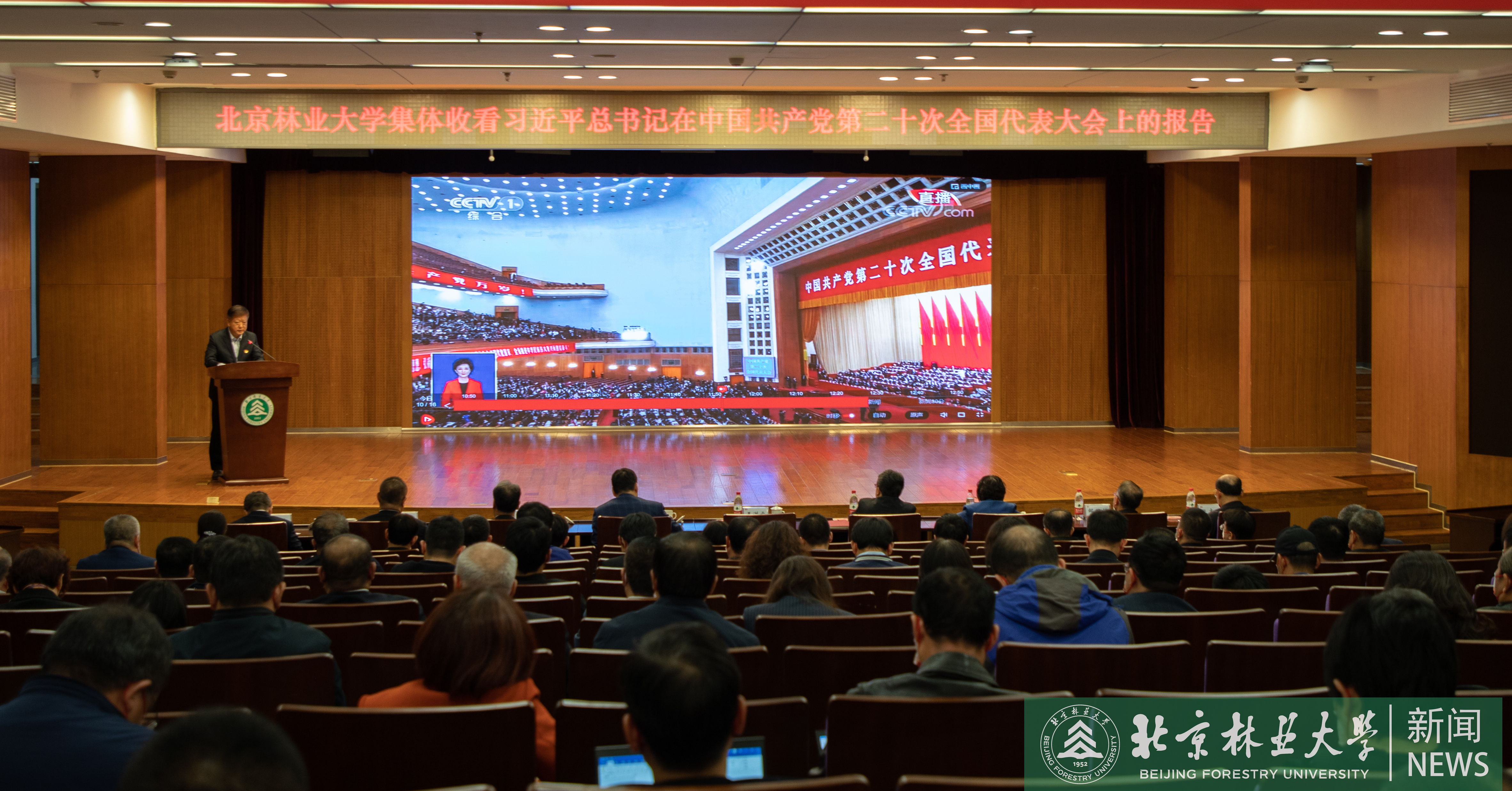 中國共產黨第二十次全國代表大會于10月16日上午10時在人民大會堂大禮堂開幕。北京林業大學全體校領導、各部門負責人、教師黨支部書記代表、教師代表共160余人集體在學研大廈報告廳觀看習近平總書記在中國共產黨第二十次全國代表大會上的報告。