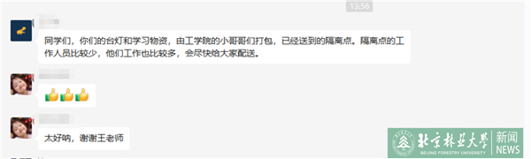 “住的條件怎么樣,還缺什么?”“屋子里暖和嗎?”“物資已送達”“北林就是你們最堅實的保障!”一條條來自學(xué)院教師和學(xué)工干部關(guān)切的消息發(fā)送到隔離師生的手機上。