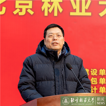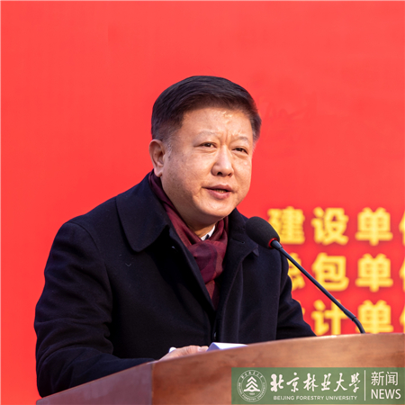 王洪元在奠基儀式上講話,他代表校黨委向長期以來為開工準備付出辛勤努力的所有同志表示感謝。他強調,建設林科科研實驗樓是我校黨委長期主抓的一件大事,是惠及北林師生的重大民生工程,將極大完善我校科研設施條件、緩解實驗用房壓力,必將有力提升我校人才培養質量、科學研究水平和服務國家戰略能力,必將推動我校在服務國家生態文明建設主戰場上作出更大貢獻。他提出三點希望,一是統籌把握工程質量和施工進度。要牢固樹立質量意識、效率意識和精品意識,嚴格按照建筑行業標準規范施工,始終把確保施工質量擺在第一位,將林科科研樓建設成讓我校放心、讓師生滿意的精品工程。二是重點做好工程管理與施工服務。要堅持管理與服務并重,為工程建設營造良好環境,以一流的作風、一流的環境和一流的保障,做好工程建設的管理服務各項工作。三是堅決守牢安全生產底線。要按照“精精益求精、萬萬無一失”的底線要求,時刻把安全問題放在心上,壓實安全生產責任,做到施工“零事故”、確保所有參建人員人身安全。