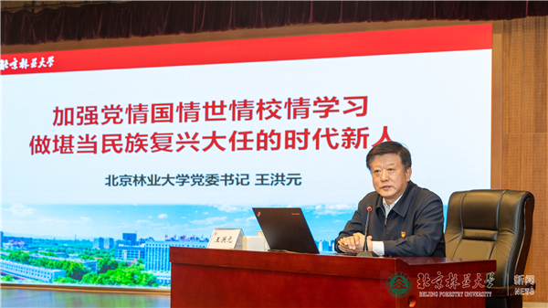 王洪元以學習貫徹黨的二十大精神為主線,帶領同學們系統學習了黨的二十大精神要義,全面回顧了過去十年黨和國家事業發展取得的歷史性成就、發生的歷史性變革。結合當前黨情國情世情校情,闡釋了國際國內的熱點問題,聚焦國家生態文明建設,講解了我校在服務國家建設中取得的跨越式發展。他與同學們共同分享了習近平總書記對青年的期望與寄語,強調同學們要堅定理想信念、聽黨話跟黨走,要珍惜大學時光、練就過硬本領,要厚植家國情懷、踐行使命擔當。勉勵同學們充分把握時代機遇,善于運用國家、社會和學校創造的良好學習條件,傳承弘揚“植綠報國”北林精神,立志做有理想、敢擔當、能吃苦、肯奮斗的新時代好青年,努力成長為堪當民族復興大任的時代新人。