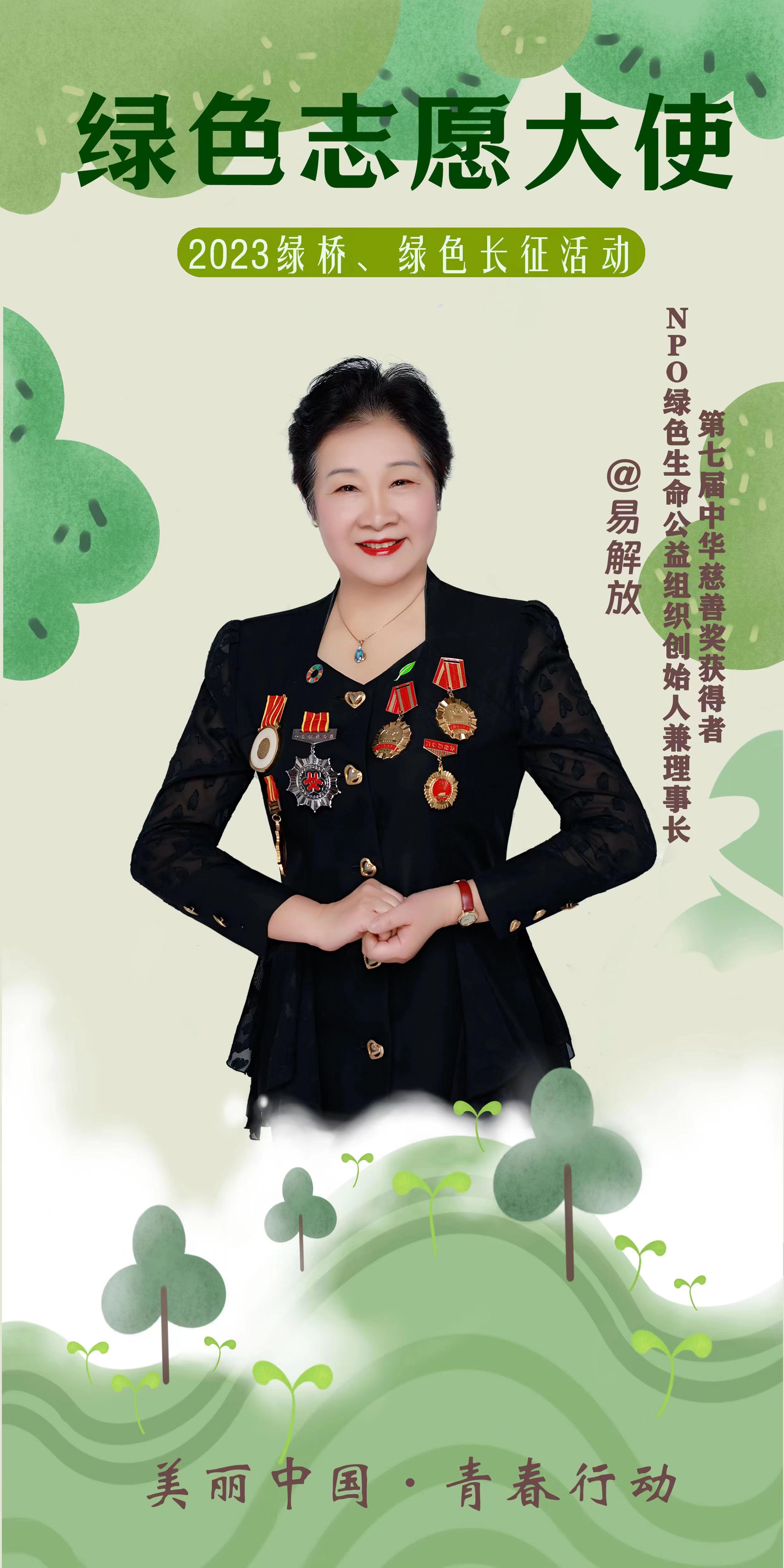2023年綠橋、綠色長征活動聘請NPO綠色生命公益組織創始人兼理事長、第七屆中華慈善獎獲得者易解放,中國第一個奪得冬奧會獎牌的男子運動員、北京2022年冬奧會首棒火炬手李佳軍,演員、全國青聯常委佟大為,浙江省綠色科技文化促進會副會長、秘書長、中國青年五四獎章獲得者忻皓為新一屆“綠色志愿大使”。