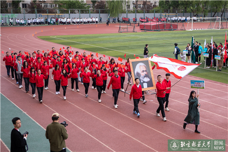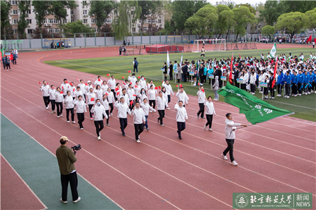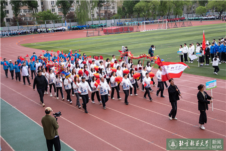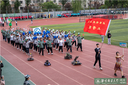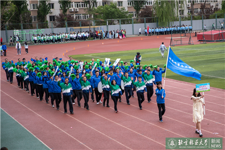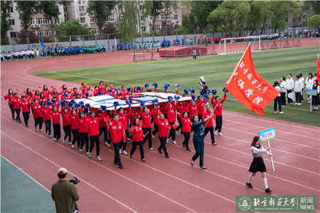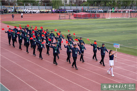 開幕式現(xiàn)場(chǎng)進(jìn)行了迎國(guó)旗、校旗、校徽儀式和運(yùn)動(dòng)員入場(chǎng)式。伴隨著激昂的《運(yùn)動(dòng)員進(jìn)行曲》,運(yùn)動(dòng)員代表們?cè)邗r花隊(duì)和彩旗隊(duì)的帶領(lǐng)下,身著統(tǒng)一的服裝,邁著鏗鏘有力的步伐入場(chǎng),堅(jiān)毅的腳步展現(xiàn)著北林師生朝氣蓬勃的精氣神。