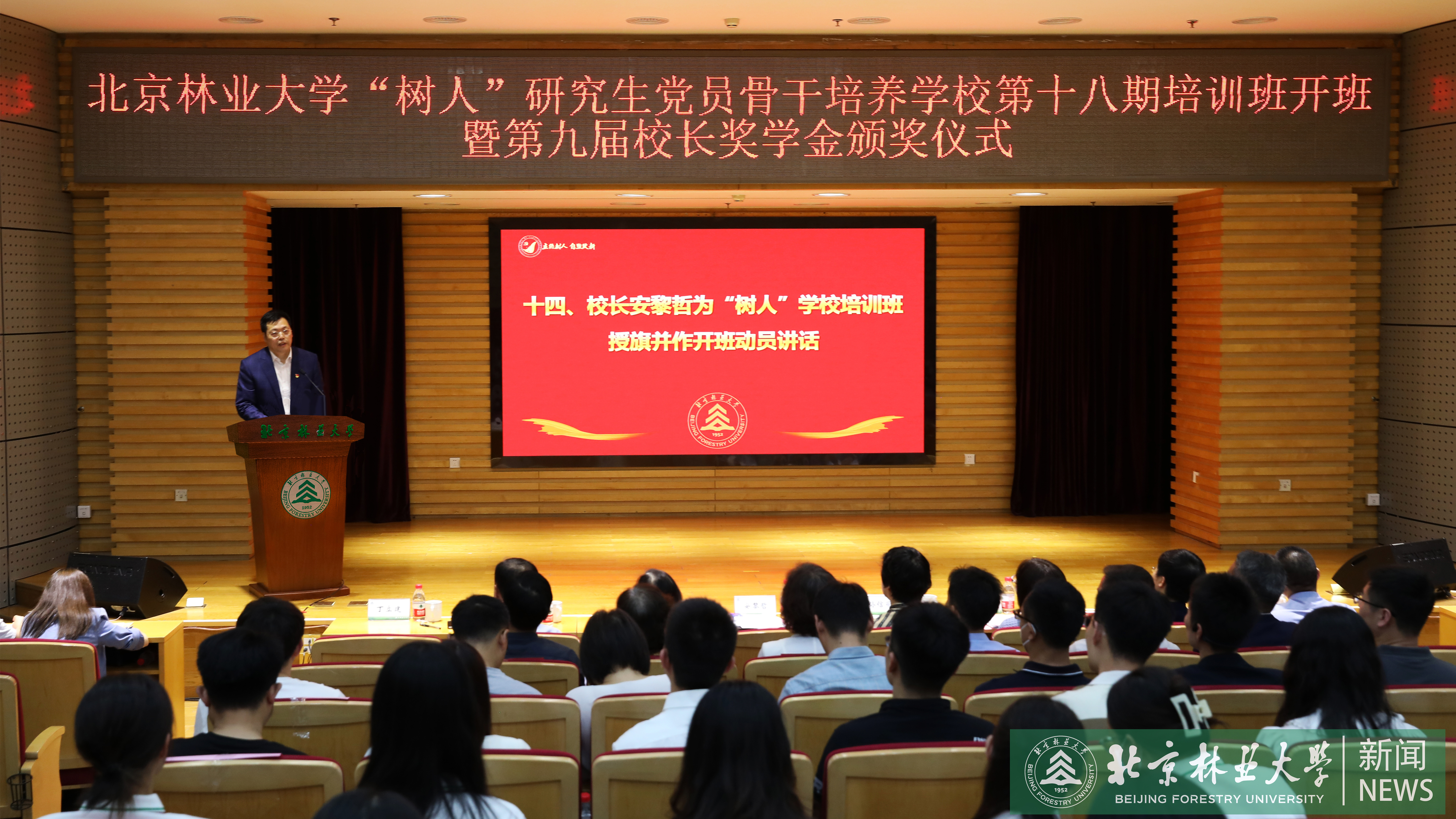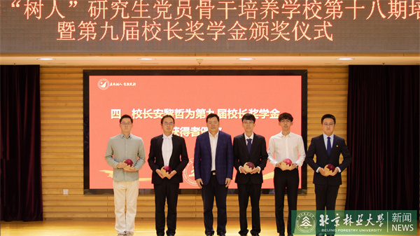 會上,安黎哲為第九屆校長獎學金獲得者頒獎,并為本期“樹人”學校培訓班授旗。