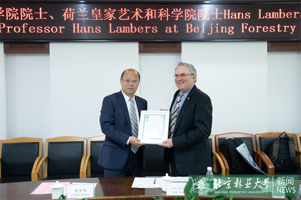 會上,李召虎為Hans Lambers教授頒發北京林業大學發展戰略咨詢委員會委員聘書。