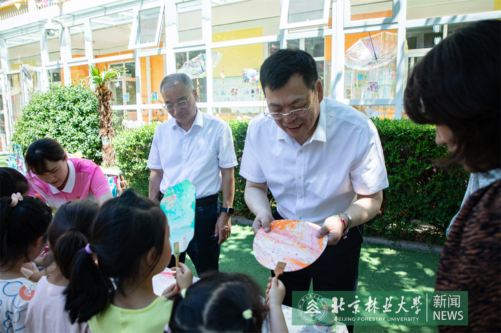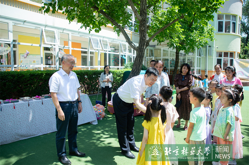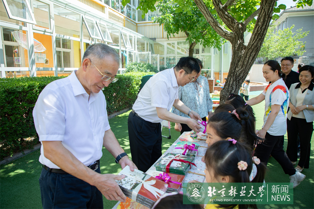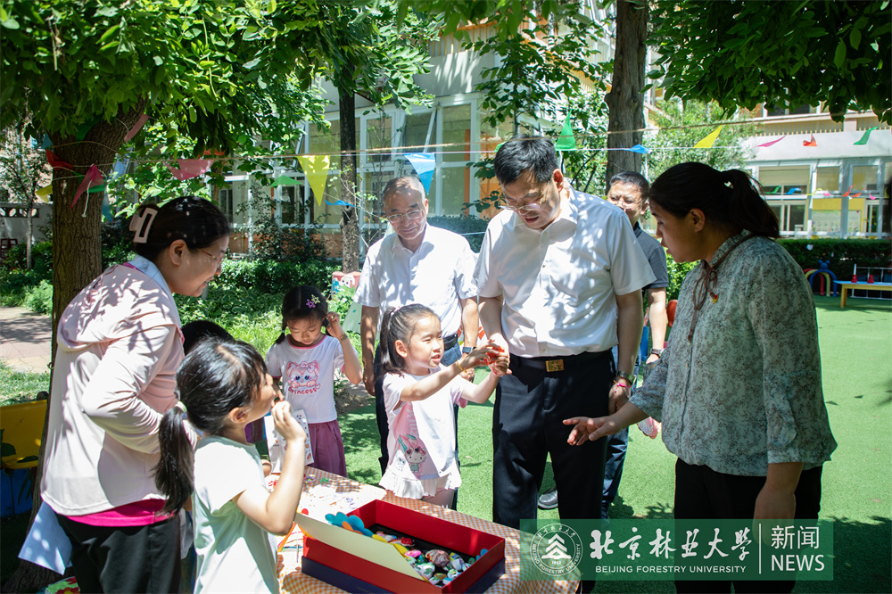在北京林業大學幼兒園,安黎哲、鄒國輝一行與孩子們親切互動,為孩子們送上節日禮物,戴上了孩子們手工編織的五彩手繩,祝愿他們健康快樂成長。