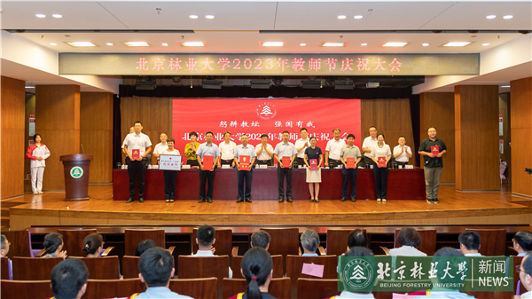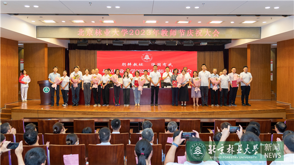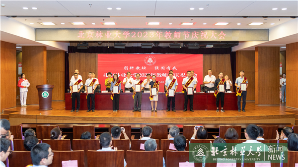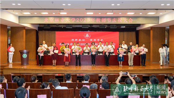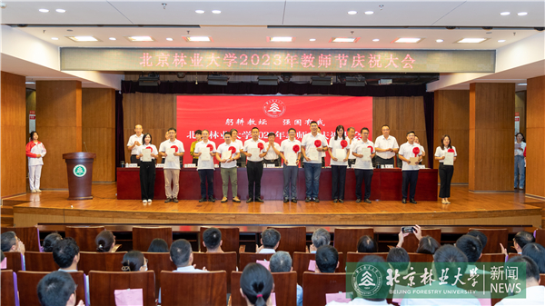 校黨委副書記謝學文宣讀《北京林業大學2022-2023年度教師獲得獎勵及稱號情況通報》,全體校領導為優秀教師代表頒獎。